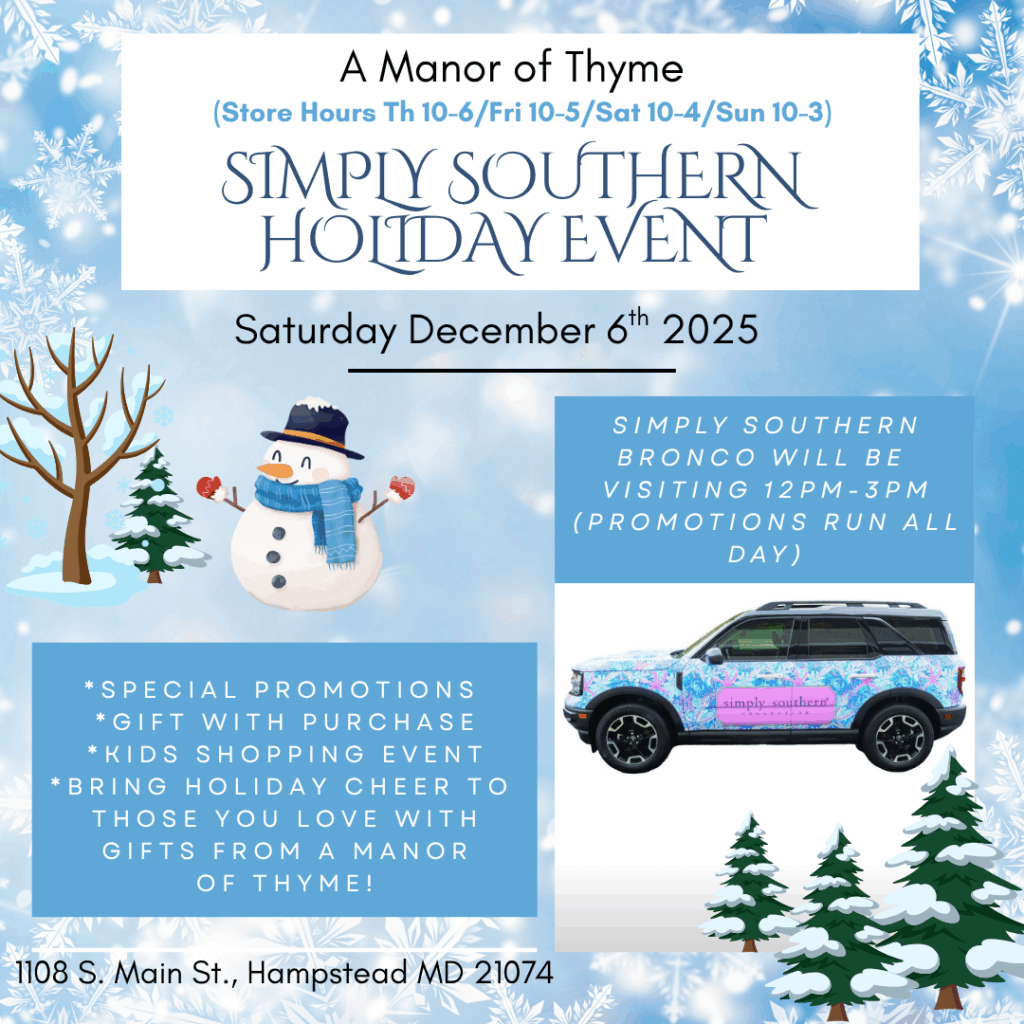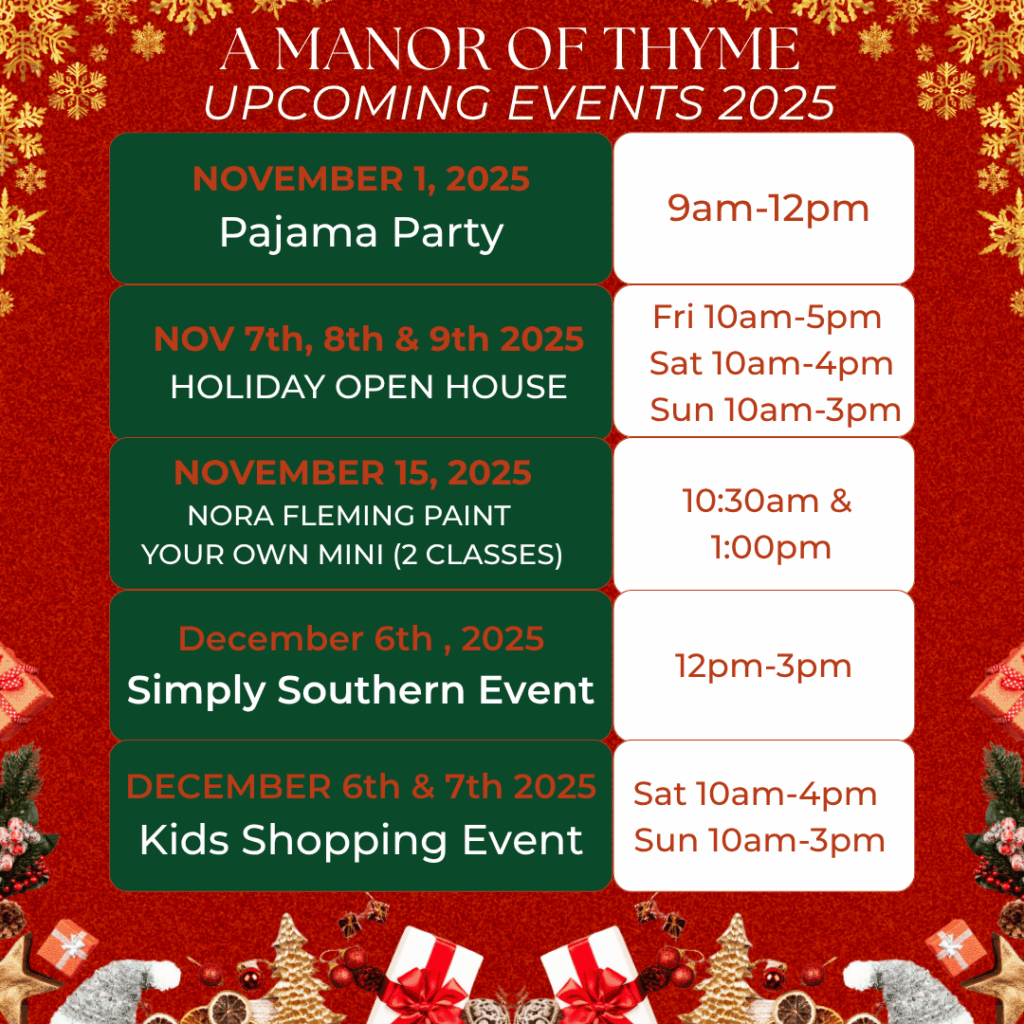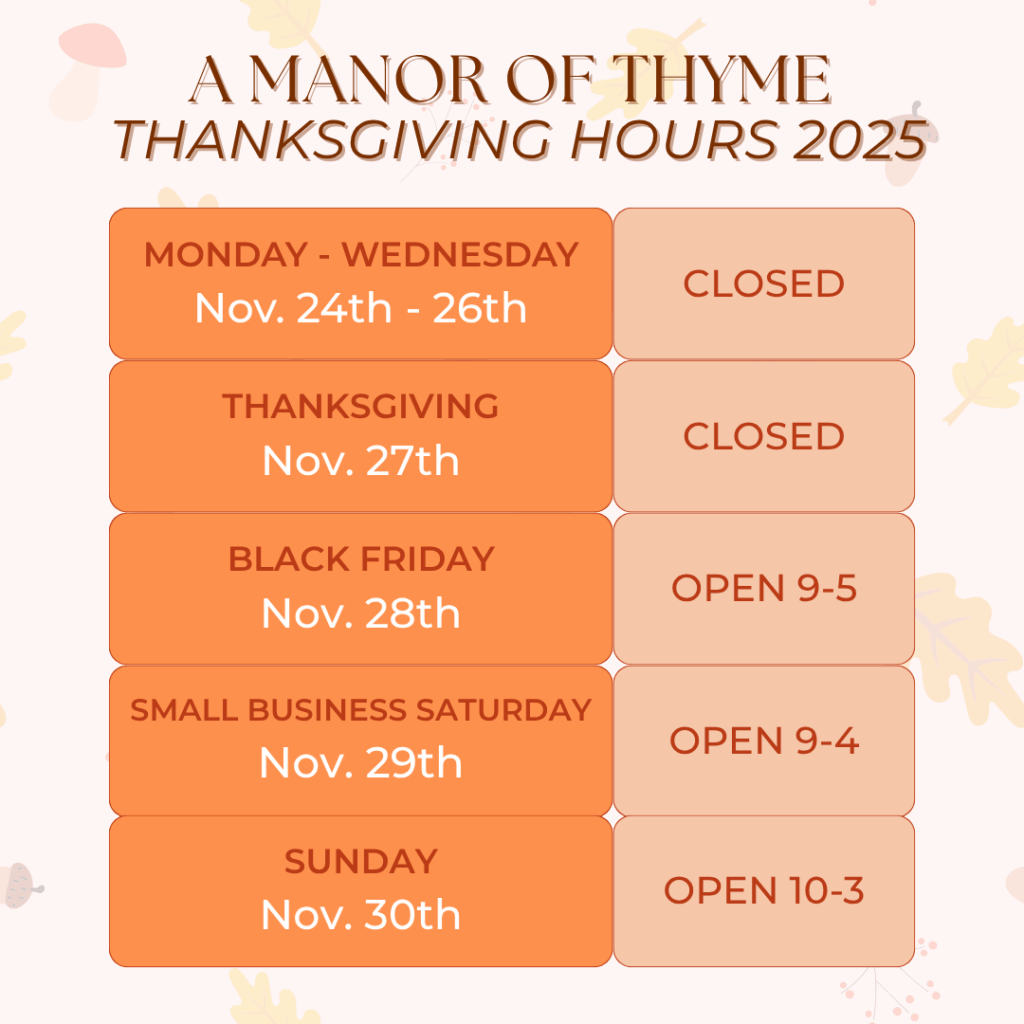 Items are mindfully curated to an ever-changing presentation based on seasons, holidays and everyday living. Our goal is to make A Manor of Thyme a positive, relaxing and welcoming place for our customers to choose treasures for themselves and others.